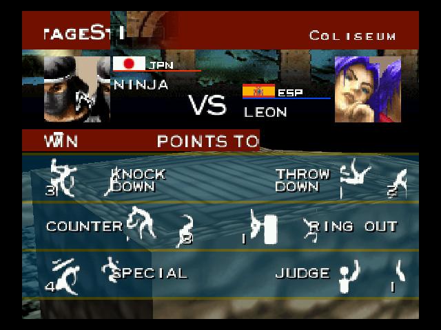 Et oui, Fighter's Destiny se démarque des autres jeux de ce genre. La grosse différence : pour gagner il faut cumuler 7 étoiles (option réglable dans le jeu) et non pas mettre son adversaire K.O. Et il y a plusieurs façons de gagner ces fameuses étoiles? Suivant l'action que vous effectuerez le, nombre d'étoiles obtenues variera. Si vous faites tomber votre adversaire hors du ring, vous obtiendrez une étoile. C'est assez difficile car vous pouvez vous rattraper sur le bord et faire tomber l'adversaire, attention donc. Si le temps imparti est écoulé, l'ordinateur jugera lequel des deux adversaires s'est battu le mieux et lui attribuera une étoile. Si vous réussissez à le mettre au sol, vous obtiendrez deux étoiles, c'est un coup simple et facile à placer mais également facile à parer. Si vous mettez l'adversaire K.O vous aurez trois étoiles. Il existe deux sortes de K.O. Le premier est le K.O par épuisement, c'est dire que vous enlevez totalement la barre de vie de votre adversaire. Le K.O spécial est difficile à placer. Il s'agit d'un coup spécial qui met votre adversaire hors de combat instantanément. Il existe une autre manière de gagner trois étoiles. Certains coups sont appelés « riposte ». Lorsque vous les effectuez, si l'adversaire vous attaque, vous le mettez automatiquement à terre et vous gagnez les étoiles. Enfin le coup spécial vous rapporte quatre étoiles. Pour ce faire, lorsque l'ennemi est étourdi (et de couleur violette) vous pouvez soit le finir d'un coup normal (amène un K.O donc 3 points) soit utiliser un coup spécial et gagner quatre points. Voilà en ce qui concerne les modalités du combat.