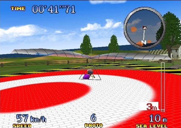 Le gameplay est en fait divisé en trois parties, qui correspondent aux trois véhicules principaux : le deltaplane, le gyrocoptère et le jetpack (ou rocket belt). Vous vous doutez que la manière de jouer doit changer quelque peu en fonction des engins, eh bien vous avez raison. En deltaplane, on part toujours d'un point élevé, et le seul moyen de gagner de l'altitude est de traverser des colonnes d'air chaud. Dans ce mode, il faudra souvent prendre des éléments du décor en photo ou passer au travers d'anneaux. Le gyrocoptère est une espèce de croisement entre un hélicoptère et un petit avion. L'appareil est assez fun et intuitif à utiliser. Là aussi, il faudra souvent passer au travers d'anneaux, mais le véhicule étant doté d'un lance-missiles, on devra également zigouiller des cibles ou bien ce fameux robot géant tueur. Enfin, le jetpack est plus particulier. Son maniement demande de la pratique, et surtout, se poser n'est pas une mince affaire puisqu'il faut deviner si on va toucher le sol ou passer à côté et tomber dans le vide (ou dans la flotte). Les missions exploitent bien ceci puisqu'il faudra se poser sur de petites plates-formes, ou passer au travers d'anneaux dans des endroits exigus.