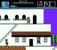Attaquons nous à présent au cœur de tout jeu, j’ai nommé le gameplay. Exploiter au mieux le peu de possibilités offertes par le pad de la Nes était un défi à la hauteur des plus grands, défi qu’Infinity semble avoir relevé avec brio. Vous aurez donc deux touches à votre disposition, à savoir l’attaque et le saut. Au fil de l’aventure et de vos rencontres avec les différentes divinités, votre équipement de base (composé au début du jeu d’une simple massue) viendra s’étoffer sensiblement, vous offrant des possibilités toutes nouvelles. Outre les classiques épées et autres boucliers qui vous seront d’un grand secours lors des combats directs, vous aurez également la possibilité d’acquérir quelques objets plus atypiques comme un Ocarina pour invoquer des dauphins, une boule de cristal utile pour révéler les passages cachés, ou encore un item vous permettant de maitriser l’élément de feu. Au final, ce n’est pas moins d’une quinzaine d’objets divers et variés que vous pourrez récupérer au fil de votre progression, chacun ayant une utilité bien particulière. Tous ces équipements seront gérables dans un écran d’inventaire assez bien pensé rappelant furieusement celui d’un certain Zelda. Bien entendu, tous ces items ne seront pas forcément gratuits. Vous devrez donc collecter des olives (apparaissant lorsque vous envoyez un ennemi en enfer) qui constitueront la monnaie du jeu. On aurait cependant apprécié que la perte d’une vie ne s’accompagne pas d’une telle dégringolade de votre stock d’olives, vous obligeant parfois à vous retaper tout le niveau en sens inverse (au risque de perdre une vie supplémentaire) pour remplir votre besace et payer ce personnage vous demandant une somme astronomique pour faire avancer l’histoire. La maniabilité souffre également d’un problème passablement gênant. En effet, votre personnage aura une fâcheuse tendance à glisser dans ses déplacements. Compte tenu de la précision nécessaire dans certains passages, ces glissades seront donc très souvent synonymes de dégringolade de votre stock de vies. Malgré cela, nous sommes en présence d’un gameplay incroyablement complet pour un jeu Nes. Les nombreuses possibilités offertes vous permettront, à n’en pas douter, de vous sortir des situations les plus délicates…après pas mal d’entrainement…