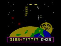 Afin d’être le plus exhaustif possible, nous allons parler de la version + de Terrahawks. Celle-ci, comparée à la version lambda, nous offre un arrière-plan qui, bien que prêtant à sourire aujourd’hui, en jetait à l’époque, surtout comparé à ce qui se faisait au même moment chez les concurrents et leur fonds monochromes. Ici, point d’animations de fond mais bien un paysage détaillé nous montrant la planète Terre (en trois couleurs s’il vous plaît) surmontée de son satellite naturel et d’un ciel noir rempli de petites étoiles blanches et rouges. Ce n’est pas grand-chose, mais à l’époque, c’était un argument de taille pour acheter une version upgradée de la console.