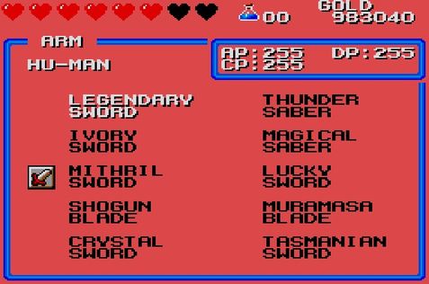 Le principal facteur de simplicité provient des continues qui sont illimités. De plus, si la difficulté est progressive (notamment à cause des ennemis changeant de couleur pour accroître leur puissance, les fourbes!), vous gagnerez des cœurs au fil du jeu, lesquels, à l'instar d'un Zelda, augmenteront votre jauge de vie maximale. Or, si au début de l'aventure vos deux cœurs -voire trois- seront tout juste suffisants pour vous maintenir en vie, à partir de quatre vous ne mourrez que rarement, puisque certains ennemis vous donneront de quoi vous guérir une fois tués, vous laissant de fait un plus grand droit à l'erreur. D'ailleurs, une armure (la Hades Armor, rien que le nom laisse présager de la suite) vous donnera même le pouvoir d'être... immortel, tout simplement. Ayant les mêmes effets qu'un fiole, elle vous réanimera dès que vous serez mis au tapis, en contrepartie de quoi elle disparaîtra de votre inventaire pour de bon si vous la retirez.