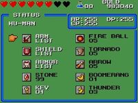 La Fire Ball sert à lancer une petite boule de feu (comme son nom l'indique), qui part en zigzaguant en direction d'un ennemi pour lui infliger des dégâts. La Tornado lance une petite tornade au sol qui aura l'avantage de rebondir sur les murs afin de retourner frapper l'adversaire, à condition qu'il soit à proximité. L'Arrow consistera en un projectile à envoyer en l'air, utile pour tuer les ennemis volants comme les nuages. Le Boomerang sera le plus utile, car il reviendra toujours vers vous, s'octroyant par conséquent un aspect illimité contrairement aux autres items qui à chaque utilisation sortent de votre inventaire, à moins d'en avoir récolté plusieurs; il faut néanmoins faire attention, car si vous bougez trop, il est possible que votre boomerang ne retourne pas dans la bonne direction. Enfin, le Thunder enverra un flash qui frappera tous les monstres présents à l'écran. Comme je l'ai dit précédemment, ces items seront en nombre limité, vous pourrez en récupérer 99 chacun, mais à chaque utilisation, le nombre dans votre inventaire s'en verra amoindri.