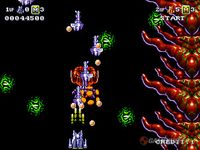 Commençons par les réglages des options, je ne suis pas trop mauvais en shoot mais j’aime bien voir les possibilités de réglages de la difficulté de ce genre de jeu, ça me donne toujours une idée de ce qui m’attend et de si je vais transpirer comme un âne pour vaincre le premier boss. Il est donc possible de choisir le nombre de crédits (3 maxi), le nombre de vies (très peu également seulement 5), mais également le nombre de tirs ennemis à l’écran (8, 12 ou 16), ainsi que leur vitesse ! Mmmmhh ça pue, le jeu ne doit pas être franchement facile. Côté manette rien de plus simple : bouton A pour tirer, B pour larguer la fameuse bombe « nettoyage » présente dans une majorité des shoots, qui éradique tout ce qu’il y a sur l’écran (3 bombes au départ du niveau). Il y a quatre armes différentes améliorables à condition de ramasser les capsules en forme de X lâchées par certains ennemis, cinq niveaux d’armes sont disponibles (les X changent de couleur une fois largués, il suffit de prendre 5 X rouges à la suite par exemple pour avoir l’arme à son degré le plus puissant). C’est un peu le même système que dans Raiden Project pour les connaisseurs. Très bon point pour le soft, il est possible de jouer à deux simultanément ! Cependant le jeu déjà difficile devient particulièrement infaisable à moins d’avoir deux joueurs siamois possédant le même cerveau, ou de vrais jumeaux qui fonctionnent avec le même neurone depuis la naissance. Une cohésion parfaite est indispensable pour espérer voir la fin du jeu en mode deux joueurs.
