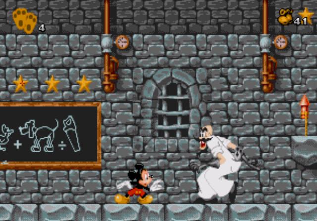 Pour le reste, on est dans un jeu de plates-formes classique comme il s’en faisait beaucoup à l’époque. D’ailleurs, aussi efficace que soit ce genre de jeu, le public commençait à se lasser en 1994. Les petits gars de chez Traveler’s Tales ont alors eu la bonne idée d’alterner ces niveaux classiques avec d’autres utilisant de nouvelles technologies comme la 3D. On verra aussi apparaitre des stages au rythme trépidant tels que celui où Mickey, perché sur un chariot d'hôpital, traverse une aire pleine de scies circulaires, ou encore un passage où il doit monter le plus vite possible à l’étage alors que la lave est en train de s’élever sous ses pieds.