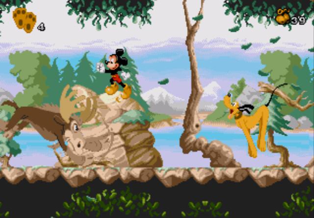 Soulignons aussi l’utilisation, novatrice en 1994, d’une pseudo 3D (proche du Mode 7 de Nintendo) pour certains éléments, ce qui viendra donner un plus grand réalisme à certaines animations (vases qui tombent, caisses qui bougent…) ou encore un effet de profondeur et de perspective aux niveaux visités par le rongeur. Certains passages sont carrément dans un univers en trois dimensions. Ainsi, un caribou pourchassera notre héros dans une colline où l’on peut aller de gauche à droite et d’avant en arrière, Mickey devra aussi descendre une tour en empruntant un escalier circulaire .