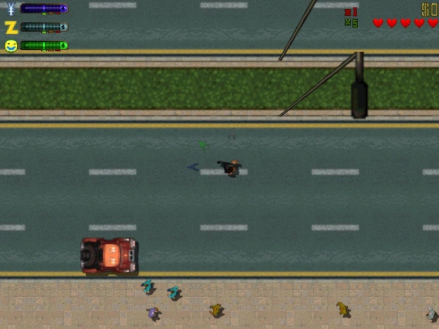 Pour en revenir au gameplay à proprement parler, sachez que le jeu se joue toujours en vue aérienne. Tout est donc vu de haut. Cela n'entache pas trop la maniabilité, même si la vue adoptée par la suite dans GTA III est bien plus pratique. Il est toujours possible de voler n'importe quelle voiture qui passe (plus de motos par contre).