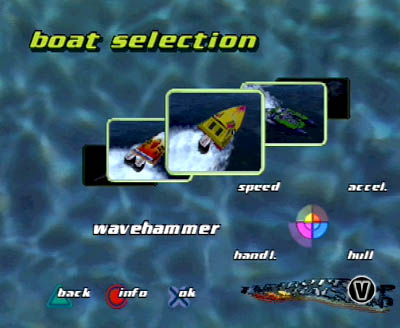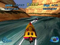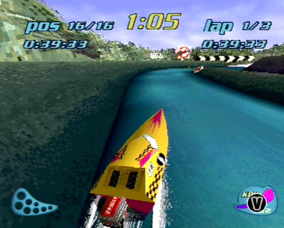 Les speedboats ont un design sympa en général, certains plus stylés que d’autres. C’est du côté des décors qu’est la faille. Les textures sont très pauvres, c’est le moins qu’on puisse dire ! Les côtes sont d’une couleur uniforme et leurs formes sont très polygonales. Il est difficile de chercher ce qui a pu contraindre les développeurs (à la limite si la vitesse du jeu était hallucinante à la Wipeout). Seul le rendu de l’eau est assez remarquable comparé au reste ! Bref, Rapid Racer n’a pas vraiment à se vanter de sa réalisation : le poids des années n’est pas en reste non plus.