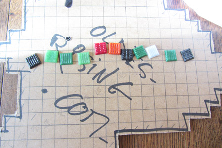 Ensuite je regarde sur mon sprite imprimé sur le papier, quelles couleurs composent cette ligne, puis je pioche les carreaux de mosaïque et je les mets dans l'ordre sur le dos (C'est à dire la face plate contre la planche) (Image 26).
