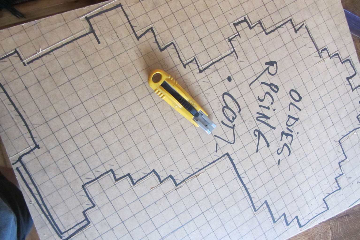 Une fois le sprite imprimé, je trace une grille correspondant à chaque ligne et colonne de pixels, car je trouve ça vraiment plus pratique pour s'y retrouver. Cette grille nous servira à connaître le nombre de carreaux de chaque couleur. Pour cela, comme on peut le voir sur les photos, on ouvre la trousse et on fait péter le BIC (Image 6).